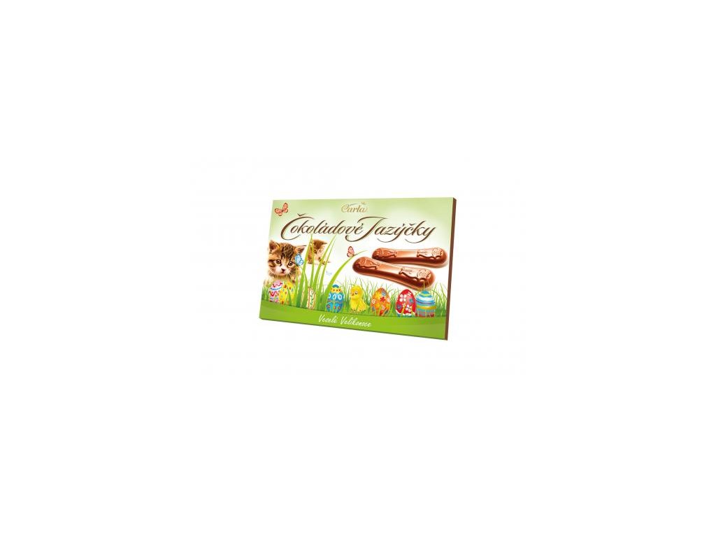Čokoládové jazýčky Velikonoce od značky Carla jsou vyrobeny z kvalitní mléčné čokolády s minimálním obsahem kakaové sušiny 32%. Jejich jemná textura a bohatá chuť z nich činí ideální sladkost pro velikonoční svátky nebo jako malý požitek kdykoli během dня.