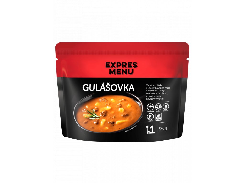 Vydatná polévka s kousky hovězího masa a brambor. Maso je orestované na cibulce a paprice, zalité hovězím vývarem.