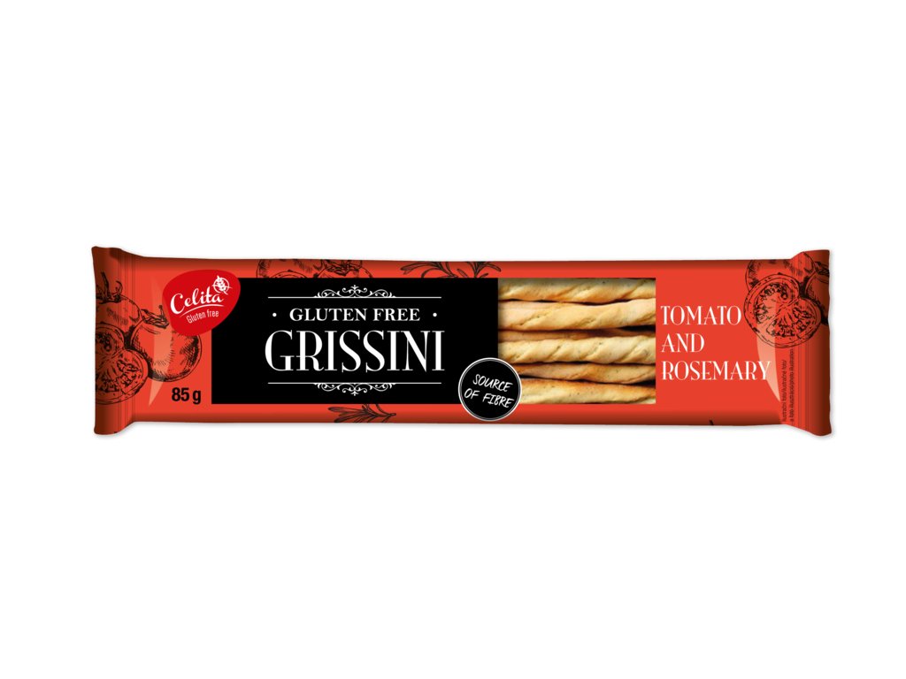 Trvanlivé křupavé tyčinky bez lepku s příchutí rajčete a rozmarýnu, vzhledem k nízké kalorické hodnotě ideální pro večerní chroupání u televize či ke skleničce vína.