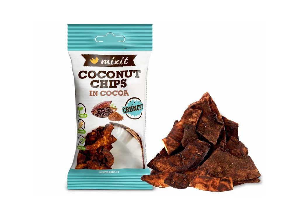 Mixit kokosové chipsy do kapsy - Kakao jsou křehké plátky z kokosového ořechu obalené v poctivé vrstvě kakaa. Vhodné i pro vegany a bez lepku!