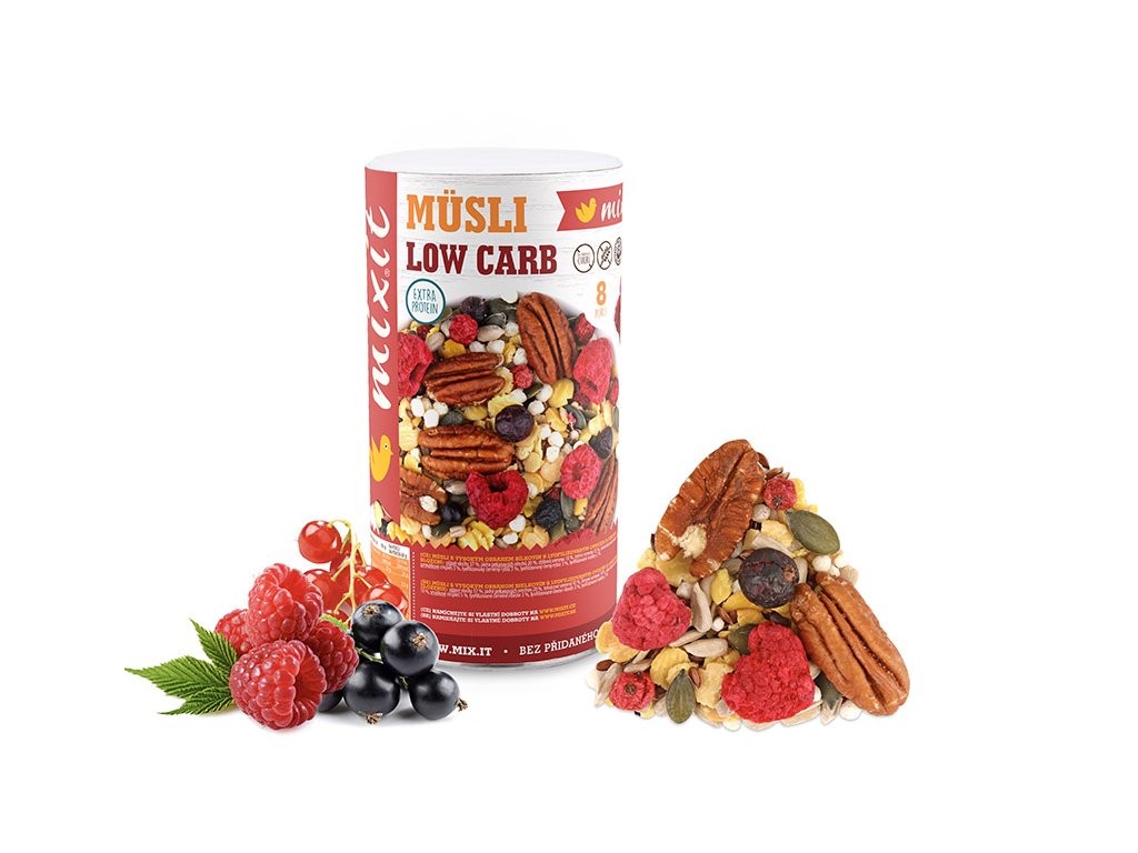 První low carb müsli od Mixit. Obsahuje jen 10 % sacharidů! Hledali jste mix müsli s minimem sacharidů a cukrů a zároveň s vydatnou porcí bílkovin a vlákniny? Je tady první "low carb" müsli, které nabídne chuťový koncert mrazem sušeného ovoce s křupinkami bohatými na proteiny, pekanových oříšků a 3 druhů semínek. Mix obsahuje pouze 10 % sacharidů a z toho jen 5,1 % cukrů z černého a červeného rybízu s malinami. 28 % bílkovin v kombinaci rostlinné a syrovátkové složky uspokojí nejen náročné sportovce. Nabijte se low carb energií od Mixit.